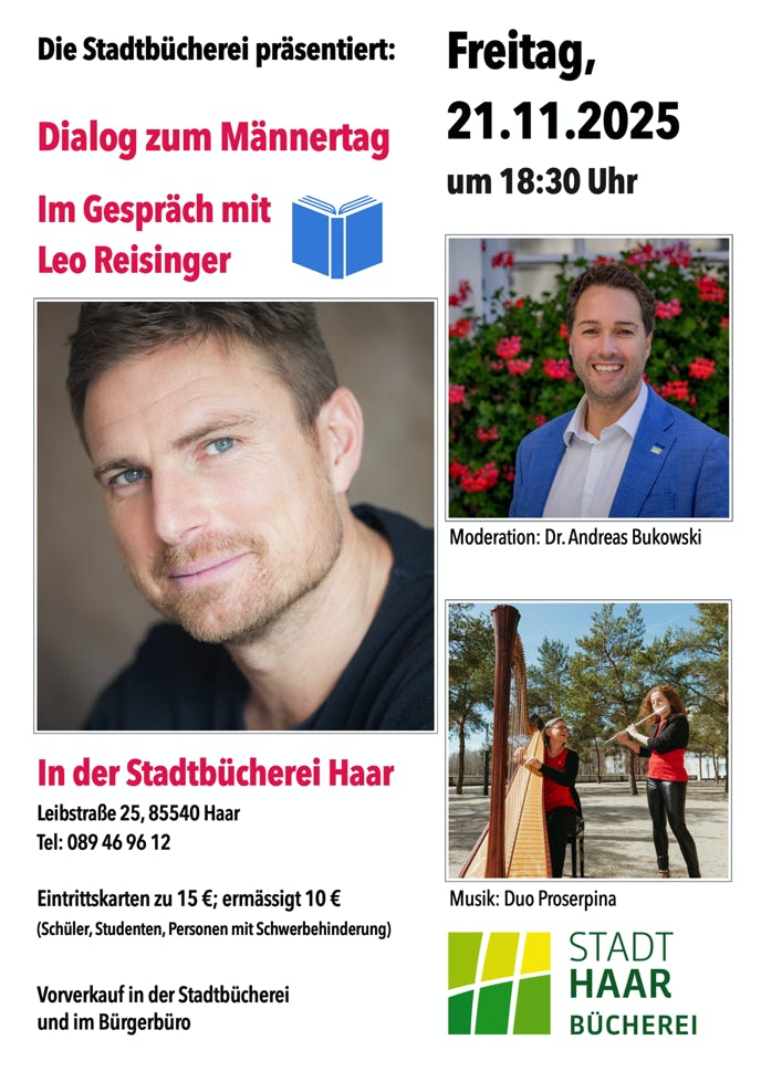 Im Mittelpunkt steht der Schauspieler, Musiker und Buchautor des Bestsellers „Bavarese“, Leo Reisinger. Gemeinsam mit Bürgermeister Dr. Andreas Bukowski spricht er über Rollenbilder, Herausforderungen und Perspektiven von Männern in unserer modernen Gesellschaft.